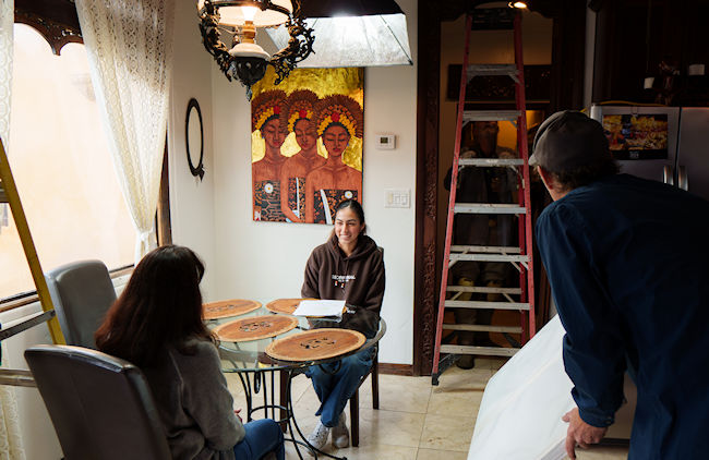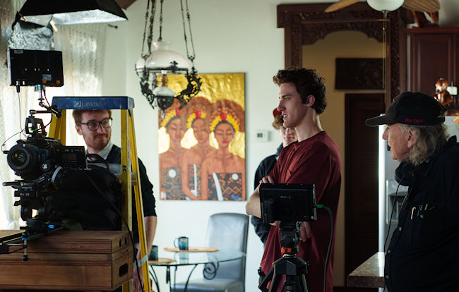 Philip Confers with Jazmyn Gonzalez (Script Supervisor) as the Gaffer Tweaks Lights